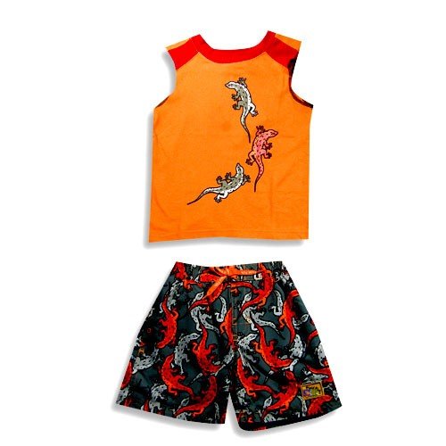 Plaid Fish - Toddler Boys 2 Piece Swim Set, Orange, Grey, Sleeveless Tee, Salamander Screen Print, Contrast Stitching, Printed Bathing Suit, Elastic Waistband, Decorative Tie, Mesh Liner, Inside Pocket, Single Back Pocket With Velcro Closure, Side Slit Pockets, Top 100% Cotton Bottom 100% Polyester, #14046.../ Plaid Fish - Toddler Boys 2 Piece Swim Set, Orange, Grey (Size 3T) / Suit Size